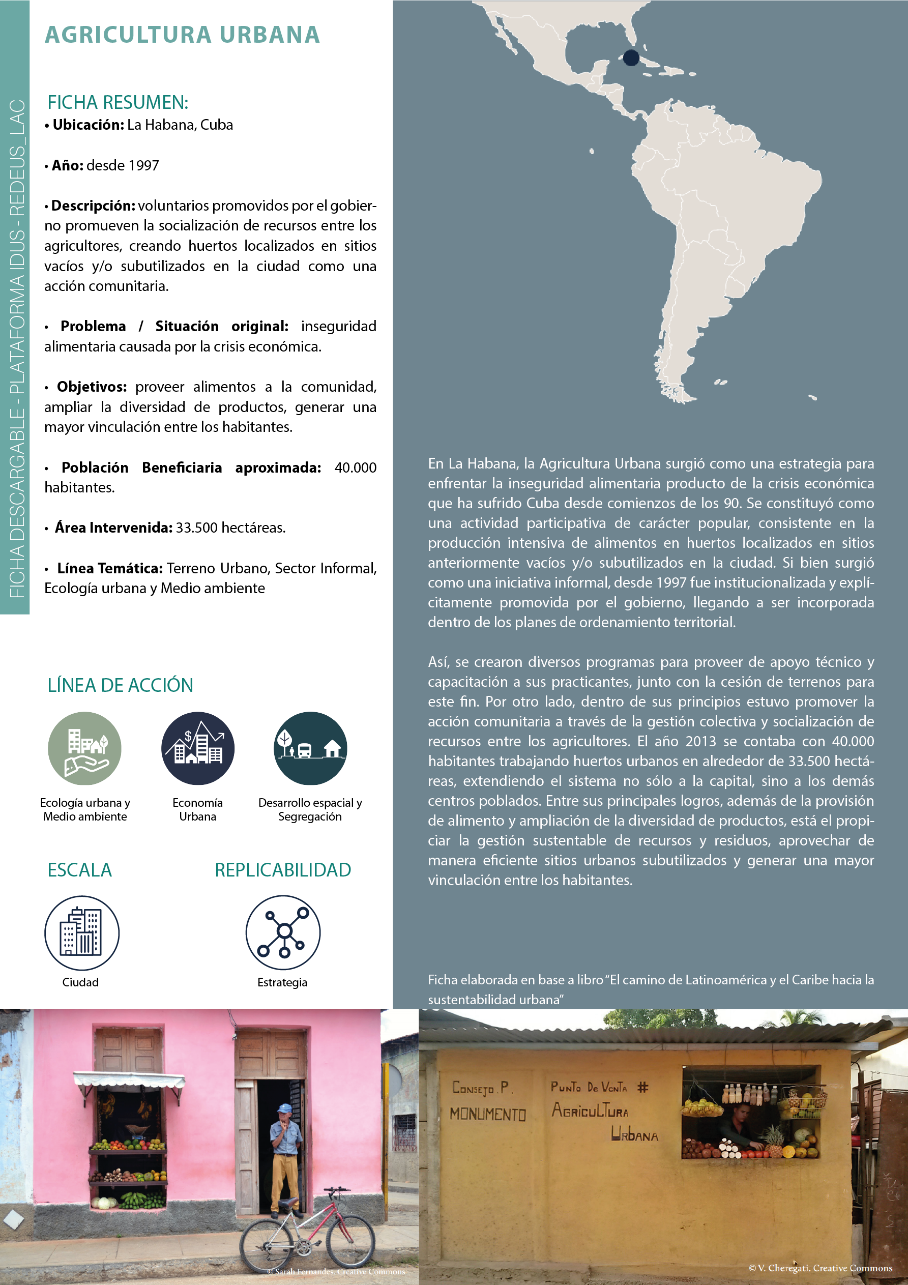En la Habana la Agricultura Urbana surgió como una estrategia para enfrentar la inseguridad alimentaria producto de la crisis económica que ha sufrido Cuba desde comienzos de los 90. Se constituyó como una actividad participativa de carácter popular, consistente en la producción intensiva de alimentos en huertos localizados en sitios anteriormente vacíos y/o subutilizados en la ciudad. Si bien surgió como una iniciativa informal, desde 1997 fue institucionalizada y explícitamente promovida por el gobierno, llegando a ser incorporada dentro de los planes de ordenamiento territorial.