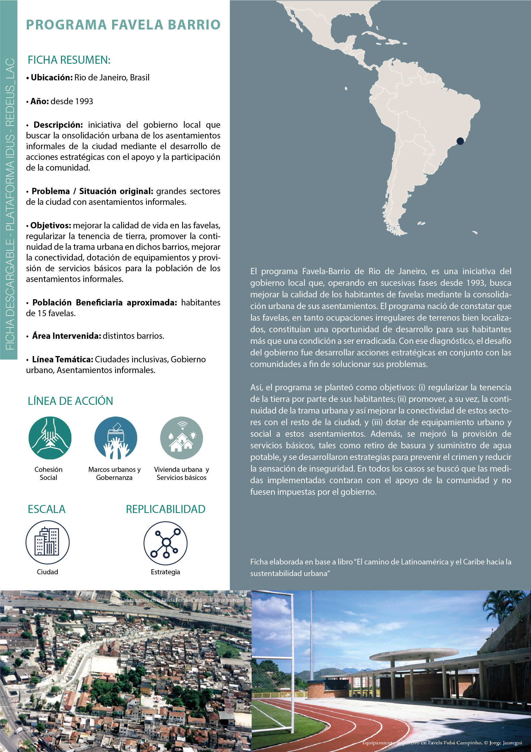 El programa Favela-Barrio de Rio de Janeiro, es una iniciativa del gobierno local que, operando en sucesivas fases desde 1993, busca mejorar la calidad de los habitantes de favelas mediante la consolidación urbana de sus asentamientos. El programa nació de constatar que las favelas, en tanto ocupaciones irregulares de terrenos bien localizados, constituían una oportunidad de desarrollo para sus habitantes más que una condición a ser erradicada. Con ese diagnóstico, el desafío del gobierno fue desarrollar acciones estratégicas en conjunto con las comunidades a fin de solucionar sus problemas. Así, el programa se planteó como objetivos: (i) regularizar la tenencia de la tierra por parte de sus habitantes; (ii) promover, a su vez, la continuidad de la trama urbana y así mejorar la conectividad de estos sectores con el resto de la ciudad, y (iii) dotar de equipamiento urbano y social a estos asentamientos. Además, se mejoró la provisión de servicios básicos, tales como retiro de basura y suministro de agua potable, y se desarrollaron estrategias para prevenir el crimen y reducir la sensación de inseguridad. En todos los casos se buscó que las medidas implementadas contaran con el apoyo de la comunidad y no fuesen impuestas por el gobierno.