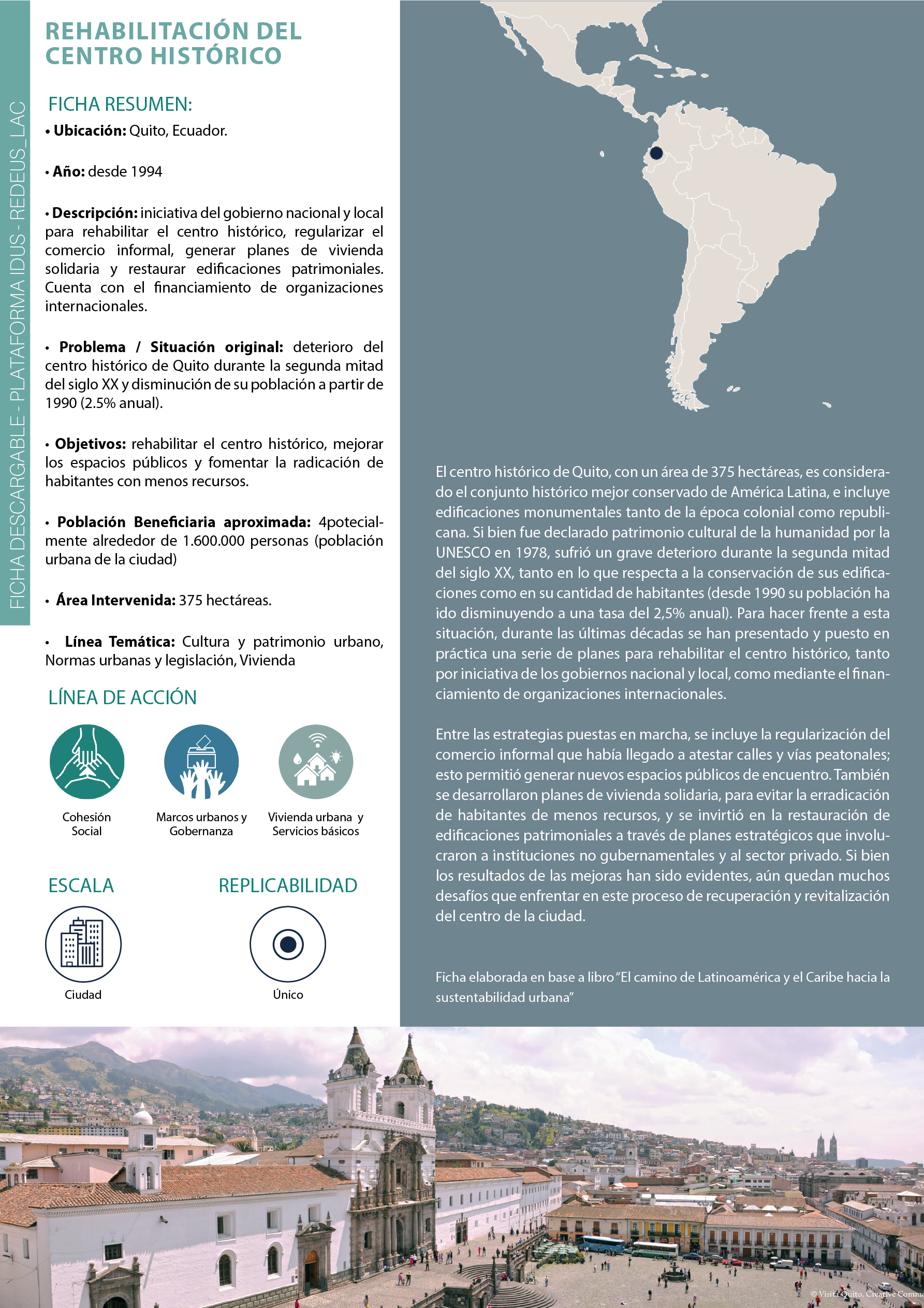 El centro histórico de Quito, con un área de 375 hectáreas, es considerado el conjunto histórico mejor conservado de América Latina, e incluye edificaciones monumentales tanto de la época colonial como republicana. Si bien fue declarado patrimonio cultural de la humanidad por la UNESCO en 1978, sufrió un grave deterioro durante la segunda mitad del siglo XX, tanto en lo que respecta a la conservación de sus edificaciones como en su cantidad de habitantes (desde 1990 su población ha ido disminuyendo a una tasa del 2,5% anual). Para hacer frente a esta situación, durante las últimas décadas se han presentado y puesto en práctica una serie de planes para rehabilitar el centro histórico, tanto por iniciativa de los gobiernos nacional y local, como mediante el financiamiento de organizaciones internacionales.